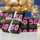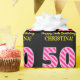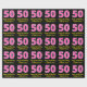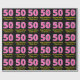 This fun birthday-themed wrapping paper design features a large number "50" with a light pink and dark pink stripes pattern, along with the message "Happy 50th Birthday,", and a custom name. The background is coloured black. Wrapping paper like this might be used when giving a gift or present in honour of somebody’s fiftieth birthday. [~Z0000376]