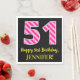 This fun birthday-themed paper napkin design features a large number "51" with a dark pink and light pink stripes pattern, along with the message "Happy 51st Birthday,", and an editable name. The background is coloured black. Fun, customisable paper napkins like this might be used at a celebration being held to honour somebody’s fifty first birthday. [~Z0000380]