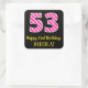 This cheerful birthday-themed square sticker design features a large number “53” with a dark pink and light pink stripes pattern, along with the message “Happy 53rd Birthday,”, and a personalized name. The background is colored black. Fun, personalized stickers like this might be given as a birthday gift, or used while wrapping presents/gifts, or perhaps used as birthday party decorations when celebrating somebody’s fifty third birthday. [~Z0000578]