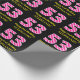This fun birthday-themed wrapping paper design features a large number "53", with a light pink and dark pink stripes pattern. It also features the message "Happy 53rd Birthday,", and a personalised name. The background is coloured black. Birthday themed wrapping paper like this might be used when giving a gift or present in celebration of somebody’s fifty third birthday. [~Z0000376]