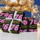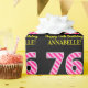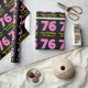 This fun birthday-themed wrapping paper design features a large number "76" with a light pink and dark pink stripes pattern, along with the message "Happy 76th Birthday,", and a custom name. The background is coloured black. Birthday themed wrapping paper like this might be used when giving a gift or present in celebration of somebody’s seventy sixth birthday. [~Z0000376]