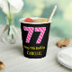 This joyful birthday-themed square sticker design features a large number “77”, with a light pink and dark pink stripes pattern. It also features the message “Happy 77th Birthday,”, plus a custom name. The background is coloured black. Birthday themed paper cups like this might be fun to use at a party being held for somebody who is celebrating their seventy seventh birthday. [~Z0000580]
