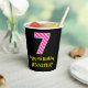 This joyful birthday-themed square sticker design features a large number “7”, with a light pink and dark pink stripes pattern. It also features the message “Happy 7th Birthday,”, plus a custom name. The background is coloured black. Cheerful paper cups like this might be fun to use at a birthday party being held for somebody who is celebrating their 7th birthday. [~Z0000580]