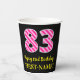 This cheerful birthday-themed square sticker design features a large number “83”, with a light pink and dark pink stripes pattern. It also features the message “Happy 83rd Birthday,”, plus a customisable name. The background is coloured black. Birthday themed paper cups like this might be used at a birthday party celebrating somebody’s eighty third birthday. [~Z0000580]