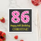 This fun birthday-themed paper napkin design features a large number "86", with a light pink and dark pink stripes pattern. It also features the message "Happy 86th Birthday,", and a customisable name. The background is coloured black. Birthday themed paper napkins like this might be fun to use at a party being held to celebrate somebody’s 86th birthday. [~Z0000380]