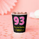 This cheerful birthday-themed square sticker design features a large number “93”, with a dark pink and light pink stripes pattern. It also features the message “Happy 93rd Birthday,”, and a personalised name. The background is coloured black. Joyful birthday themed paper cups like this might be used at a birthday party celebrating somebody’s ninety third birthday. [~Z0000580]