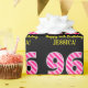 This fun birthday-themed wrapping paper design features a large number "96", with a dark pink and light pink stripes pattern. It also features the message "Happy 96th Birthday,", and a personalised name. The background is coloured black. Wrapping paper like this might be used when wrapping gifts being given to somebody in celebration of their 96th birthday. [~Z0000376]