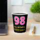 This cheerful birthday-themed square sticker design features a large number “98” with a dark pink and light pink stripes pattern, along with the message “Happy 98th Birthday,”, and a custom name. The background is coloured black. Birthday themed paper cups like this might be a fun way to celebrate somebody’s ninety eighth birthday. [~Z0000580]