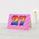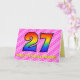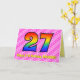 This happy and upbeat 27th birthday greeting card design has a front featuring a large number "27" having a colourful pattern inspired by the appearance of a rainbow spectrum, on a dark pink and light pink heart shapes stripes pattern background. The front also features the message "Happy 27th Birthday,", and an editable recipient name. The inside features a custom birthday greeting message, or could perhaps be cleared and left blank if a message is to be written by hand instead. A personalised birthday card like this might be a fun and happy way of sending a message in celebration of somebody’s twenty seventh birthday. [~Z0000418]