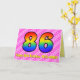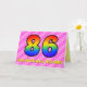 This festive and cheerful 86th birthday greeting card design has a front featuring a large number "86" having a colourful rainbow spectrum inspired gradient pattern, on a cheerful dark pink and light pink heart shapes stripes pattern background. The front also features the message "Happy 86th Birthday,", followed by a personalised recipient name. The inside features a customisable birthday greeting message, or could perhaps be cleared and left blank if a message is to be written by hand instead. A custom birthday card like this might be a fun and happy way of sending birthday wishes to somebody who is celebrating their eighty sixth birthday. [~Z0000418]