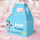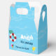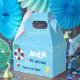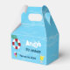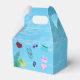 Favour box for birthday party the same design as invitation, thank you card, and other products features water pool background with swimming stuffs.