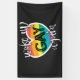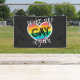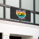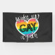 Fun pride month LGBTQ black banner featuring a colourful rainbow heart with the self-ironic caption "Woke up gay again" in black and white modern typography fonts.