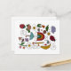 This postcard features random objects in fun colours for that nostalgic 1980's sticker book feel. The cute little illustrations include a strawberry, turtle, fried egg, tulip, leaf, rain cloud, ladybug, sun, chocolate chip cookie, boat, banana, coffee cup, balloon, daisy, yellow pencil, duck or goose, mushroom, star, ice cream cone, butterfly, umbrella, rainbow, envelope, speech bubble with the word "hi", and a carton of milk.