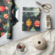 Fun and colourful ornaments hang from Christmas trees amid wisps of pine boughs and sparkling lights with the black night sky in the background. Such a cool retro design. It looks great on your holiday gift wrapping.