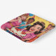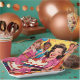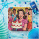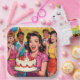 Fun birthday party paper plates with a group of retro mid-century friends celebrating! These are in pink, yellow, red and blue. The front woman is holding a vintage birthday cake.