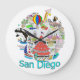 So much to see and do in beach city San Diego. San Diego is depicted through a whimsical collection of iconic landmarks and attractions, including wildlife, architecture, and amusement parks. Bright colours and playful designs convey the city's vibrant and diverse offerings.