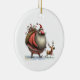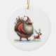 Fun Santa with a cute reindeer and his bag of gifts on a ceramic Christmas ornament. Text on back can be changed. Watercolor illustration with AI assisted graphic purchased with commercial use. Artwork: RedHeronLighthouse