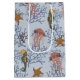 This Fun Seahorse Ocean Animals Blue Medium Gift Bag features hand-drawn sea creatures, including seahorses, jellyfish, starfish, and vibrant red coral, all against a light blue background.
