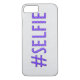 Purple polka dot pattern in "#selfie" title on white textured background.
