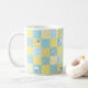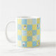 A pretty and fun Coffee Mug, with a Faux Patchwork design of Sheep motifs and patterns in Blues and Yellows, teamed with coordinating Check Ginghams and Polkas Dots.