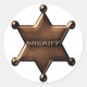 Fun birthday party sticker done in white with graphics of a bronze looking Sheriff's Badge that reads Sheriff, in the middle. Perfect as envelope seals to your western party theme invitations or as party favours for kids.