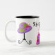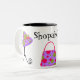 Whimsical mug, with fun graphics of a pink, lavender, and green hat, purse, and high heels. Black text at the top reads Shopaholic. Great cup for every day use at the home or office.