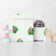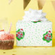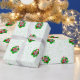 This wrapping paper roll is white with green dots and fun skeletons inside vibrant red and green spatters shapes holding ornaments up to their eyes wearing Santa hats for your Creepmas or Christmas gifts.