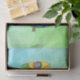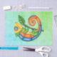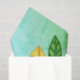 These tissue paper sheets are a mix of blues and green with a fun smiling lizard with big circle eyes done in bright colours of blue, green, orange, and yellow holding a little branch with a green leaf.