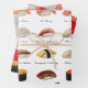 Wrapping paper that can be used throughout the year. Illustration features 20 different types of sushi on white, grey and red backgrounds.