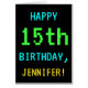 This simple, fun birthday greeting card design features a message like "HAPPY 15th BIRTHDAY, JENNIFER!". It also features a fun, pixelated look reminiscent of the appearance of retro 8-bit era video games of the 1980s and early 1990s. The name on the front and the message on the inside can be personalised. It could be sent or given to somebody who is celebrating their fifteenth birthday, and who enjoys playing vintage computer games. [~Z0000099]