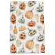 This design features a charming watercolor pattern of pumpkins and jack-o'-lanterns in a soft, muted colour palette. The design includes various pumpkin shapes and sizes, painted in gentle shades of orange, cream, and grey. Each jack-o'-lantern has a unique carved face, ranging from happy and friendly to slightly spooky, adding character and variety to the pattern. The pumpkins are arranged on a clean, white background, allowing the delicate watercolor textures to stand out. The overall design is both festive and adorable, perfect for capturing the whimsical spirit of Halloween in a cosy, artistic way.