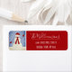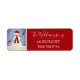 This return address label features a fun waving snowman wearing a red hat, mittens and scarf, standing in the falling snow.