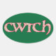Mail a Welsh 'cwtch' to your loved ones! A sheet of oval stickers with the Welsh word 'cwtch', meaning 'cuddle' or 'hug' in a Celtic script, filled with a pretty Clematis pattern on a deep green background that you can change if you wish.
