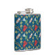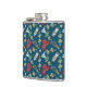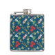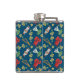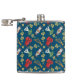 A patriotic Hip Flask, with a row of Welsh Emblems, a girl in welsh traditional dress, a red dragon, a bunch of leeks, a harp and a bunch of daffodils. This pattern can be adjusted to fit any Hip Flask and you can change the deep blue background.