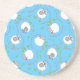 A chic, round Sandstone Coaster, with a pattern of comic sheep and 'Cymru am Byth' in Red, on a Turquoise Blue background that you can change if you wish.