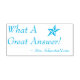 This motivating rubber stamp design features the message "What A Great Answer!" and a personalised teacher's, educator's or tutor's name. It also features a decorative star shape. It could be used by a teacher, educator, or tutor when grading student work, to acknowledge that a student has done an exceptional job.