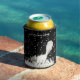 This can or bottle cooler has a black and white image of a fun white cat who is winking walking across piano keys on a black background with white music notes. Customise your text on the front and back with the template.