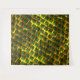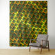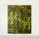 Estampado com imagens quadradas verde colocadas como se fossem tijolos em uma parede - inclinada -, onde as linhas amarelas ou douradas na volta das pequenas imagens podem parecer em alto relevo ou o fundo composto que imagem verde parece estar mais profundo que as linhas amarelo dourado que pode parecer um tipo de grade.