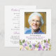 Funeral order of service/thank you note on a flat card is a simple way to thank those that attended the funeral and supported you during your time of bereavement. A photo condolence thank you note featuring a classic white background, purple lavender flowers, a photo of the deceased, memorial order of service, and a thank you template that is easy to personalise.
