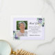 This photo funeral thank you card offers an elegant script and is accented with a watercolor graphic of purple flowers on a light purple background.
