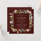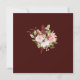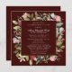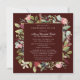 Elegant celebration of a life square invitation features a botanical frame of pink and purple flowers along with a variety of trendy foliage. A burgundy redbackground really pops the colours The deceased person's name is written in a traditional script text. All of the text can be easily edited to create a personal remembrance.