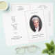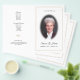 This minimalist funeral program is beautifully designed with an oval fade vignette on the photo and gold trim. The program includes special features to add a listing for family and posterity. This program requires folding.