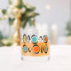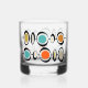 Add a pop of color to your kitchen or bar cart with this fantastic retro whiskey glass. It features abstract hanging geometric circles in the bright and bold colors of turquoise blue, two shades of orange, cream, tan, and black.