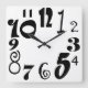A clock with funky fun numbers, in black and all different sizes and fonts on a white background. If you wish, you can change the background to a different colour by selecting the "Printed Background Colour" option.