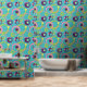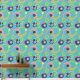 A bright blue background is adorned with a funky pattern of circles, dots, and rings in a variety of vibrant colours, including pink, green, purple, and yellow.
