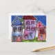 Art by Marta Harvey. This piece was created as a collage of painted papers (junk mail), put together to form these little funky houses. Once they were put together, the windows and other details were added to finish the piece.