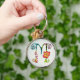 Funky letter M monogram keychain. The letter M is done in various patterns including a zebra animal print, funky checks and polka dots. It is accented with a large flower done in pink, orange and yellow. The letter m monogram stands out with its bright colours. The background is a faded aqua splatter pattern.