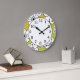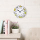 This contemporary floral decorative wall clock features black and white flowers arranged in a funky floral design. Background is yellow green with an orange halftone pattern.