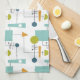 Add a pop of colour to your kitchen with this fabulous geometric line and shapes "flow chart" retro pattern kitchen towel. It features the bright and bold colours turquoise, blue, green, orange, and black.
