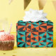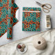 A funky modern geometric pattern in orange, black, and teal; useful wrapping paper suitable for male or female and for any occasion .